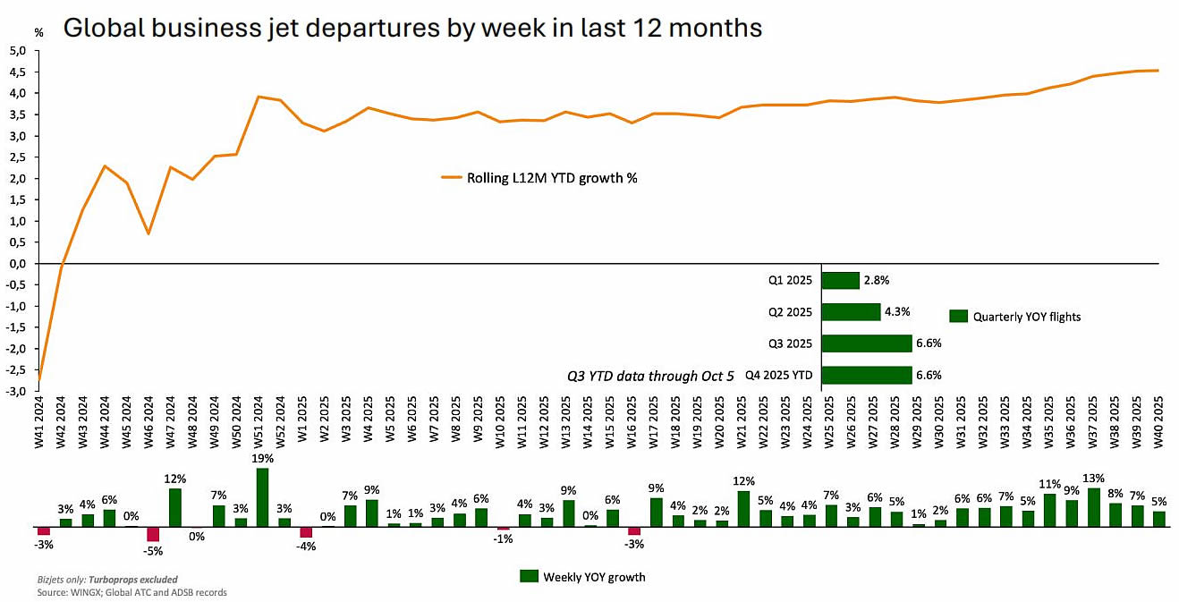 In Week 40 (29 September – 5 October), global bizjet activity reached 75,651 departures, down 5% compared to the prior week (Week 39) but up 5% versus Week 40 of 2024. On a rolling last four-week basis (W37 – W40), global business jets have accumulated 314,000 departures, an 8% increase compared to the same period last year.